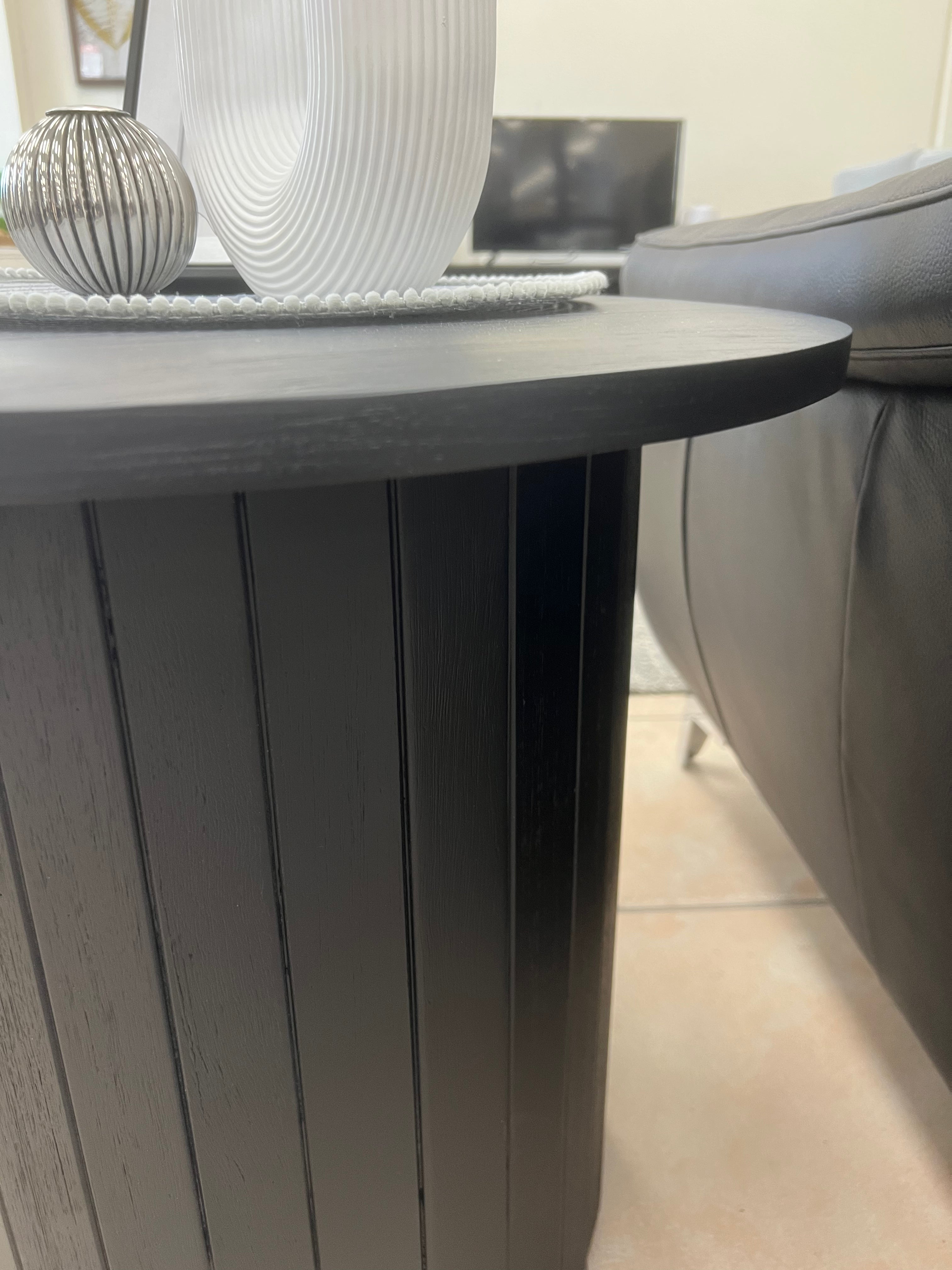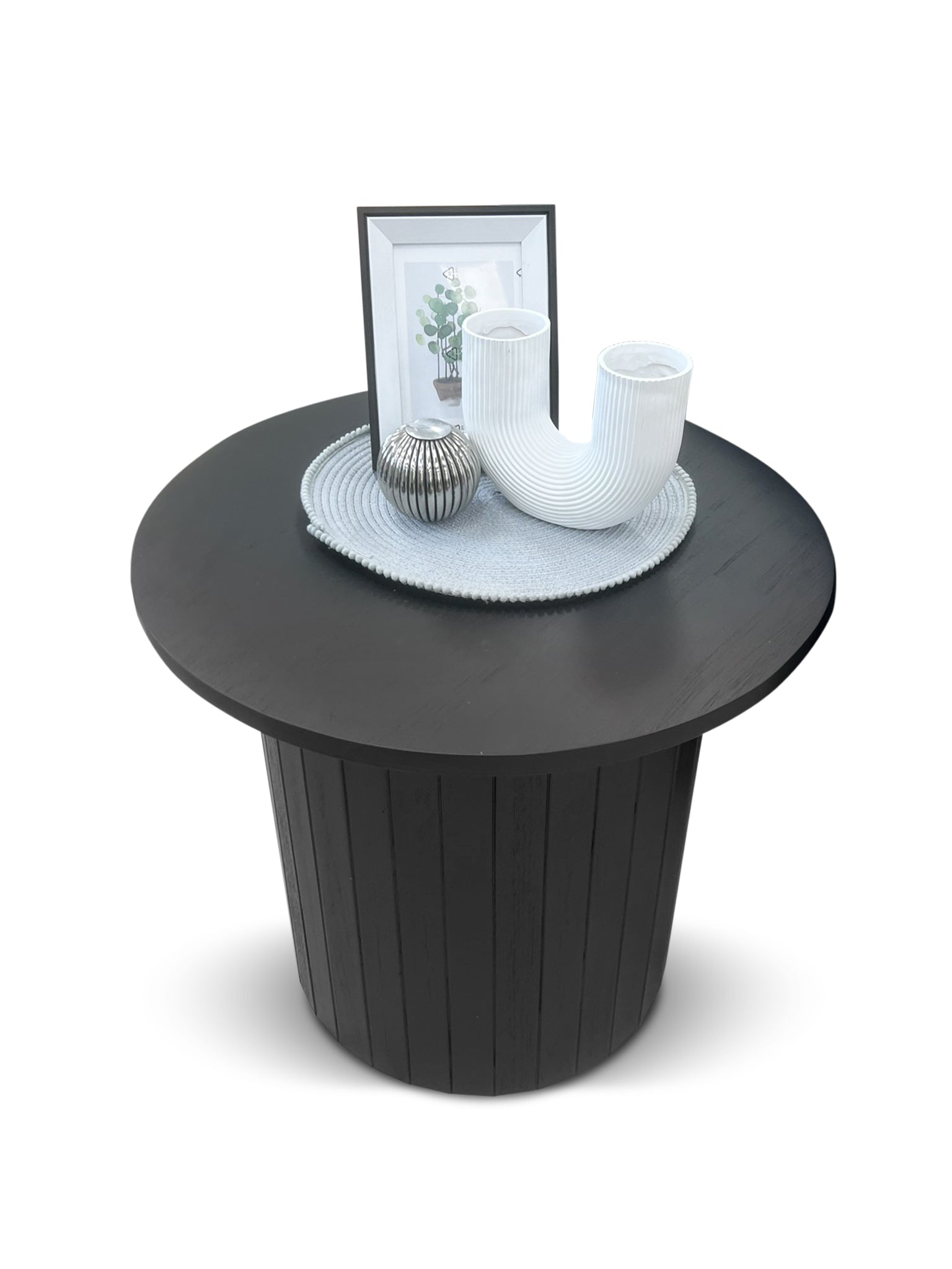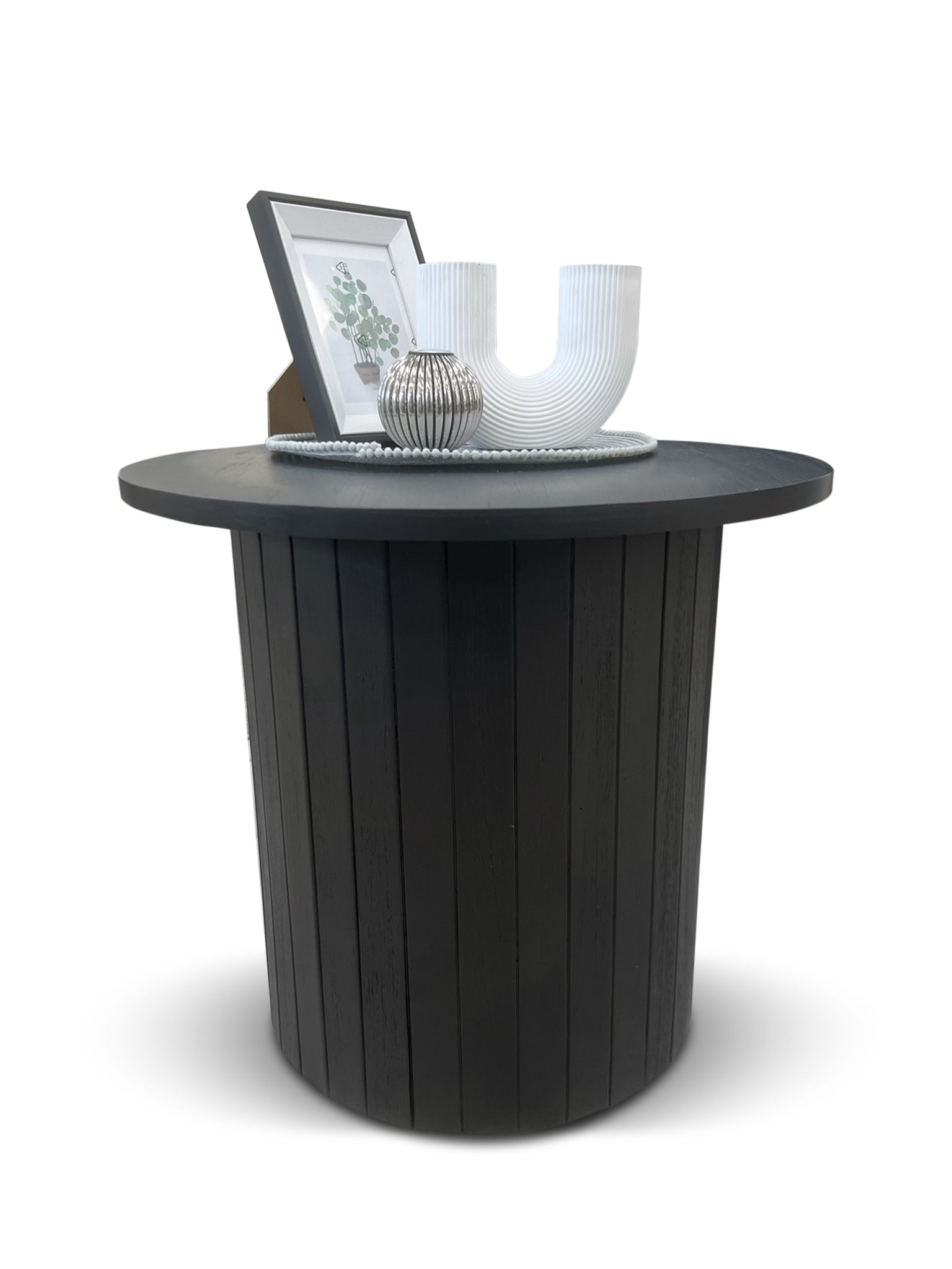 Featuring gentle curves and soft fluting. The Athena is hand crafted in solid hardwood and will make an impact in any home. The rippled cylindrical bases and bold matte black is sure to be the statement piece/s of your living space.