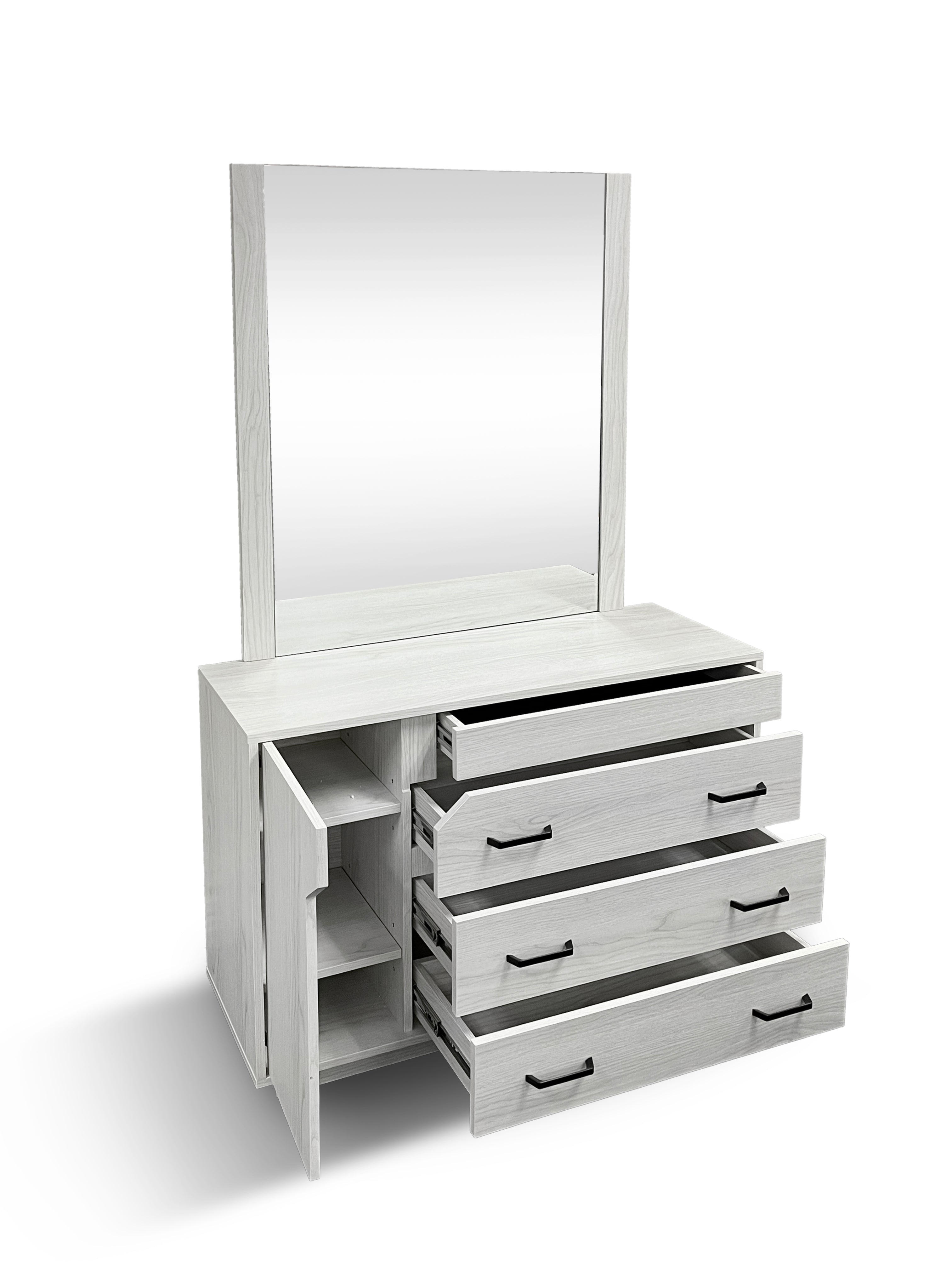 It comes with the 1m tall mirror, offers 3 generous drawers, a jewelry drawer and side cupboard for bulkier goods.