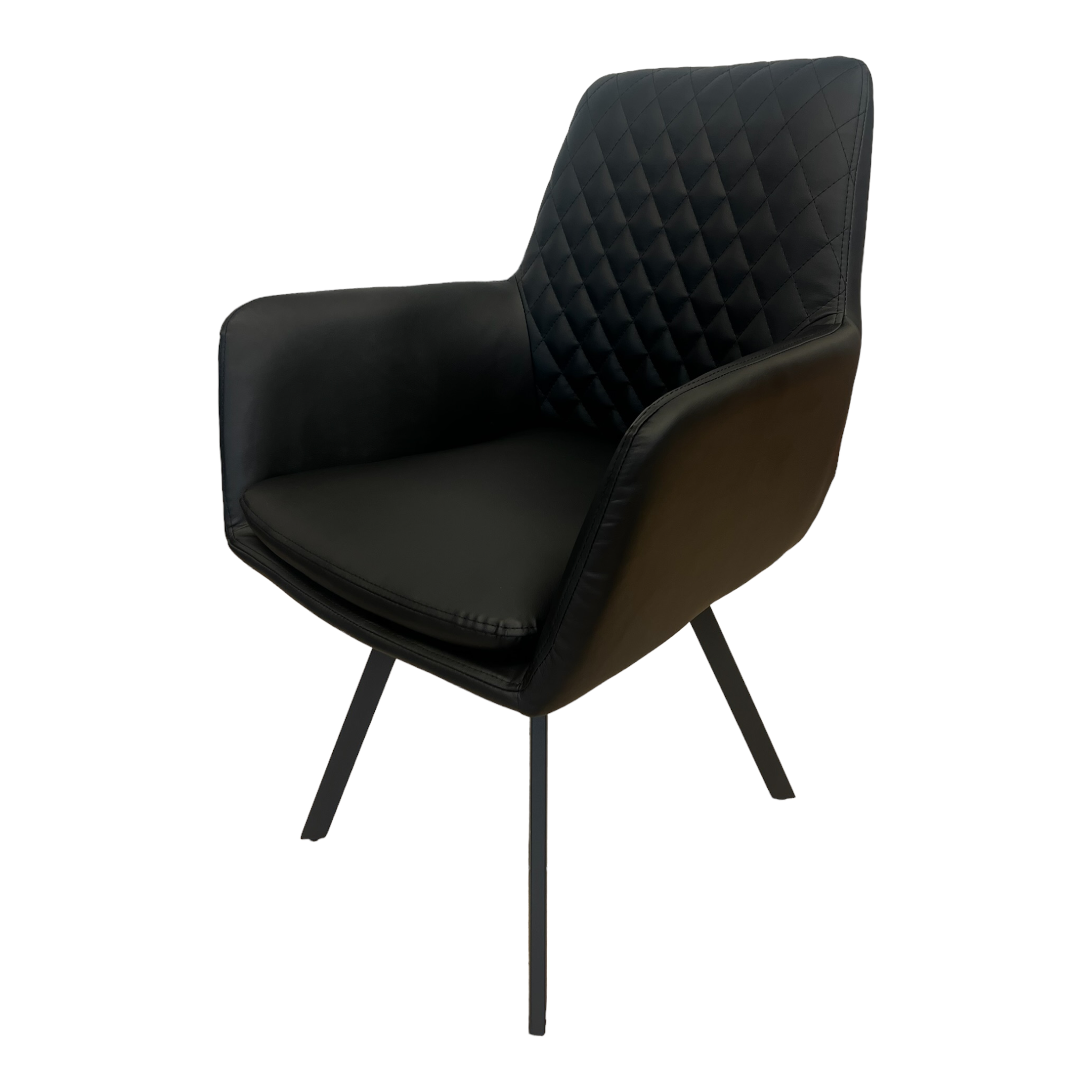 The Bermuda upholstered chair is sleek, sexy and comfortable. Built to last with full steel frame and easy clean vinyl upholstery. The black steel legs and clean black easy-care upholstery allows the Bermuda chair to match with most dining tables styles and decors.