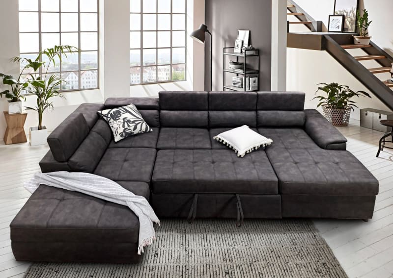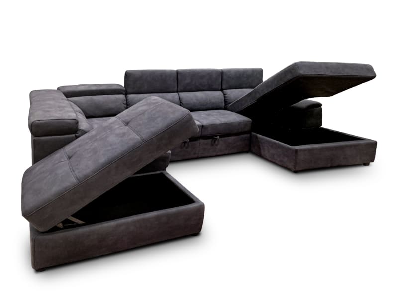 Versatility, comfort and design the Bronte is an extraordinary mix. Featuring adjustable headrests, storage ottoman, lift up storage chaise and pull out pop up sofabed. Available with left or right side chaise and fully upholstered in premium rhino suede.