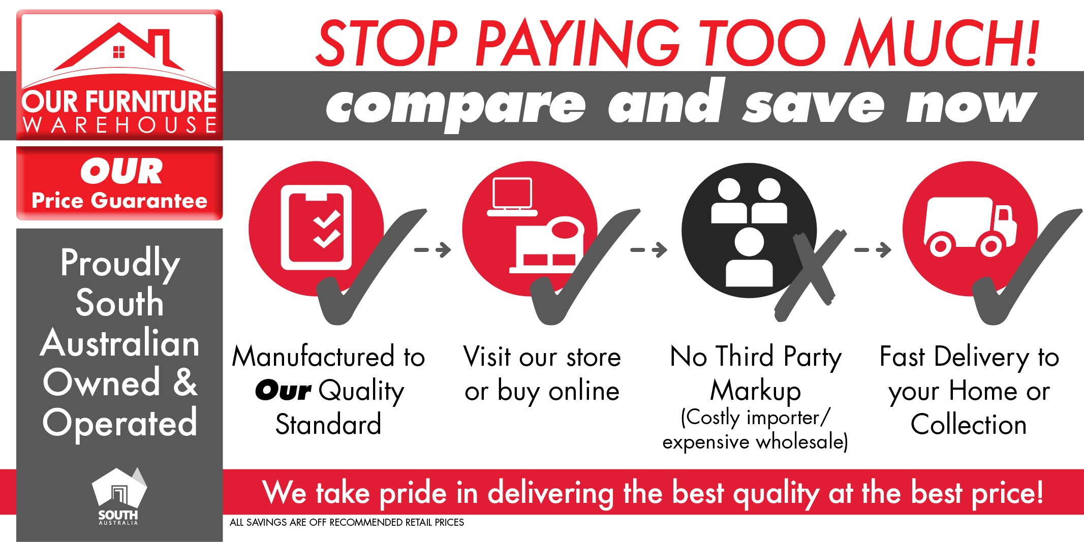 Sometimes things may be too big, too small or simply just aren’t right for your home. If this occurs Our Furniture Warehouse have a 7 day piece of mind policy. So if you don’t love your new purchase you have 7 days to return it for a full refund less any delivery / shippings costs.