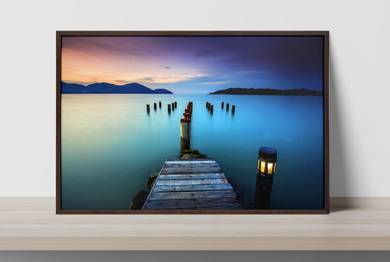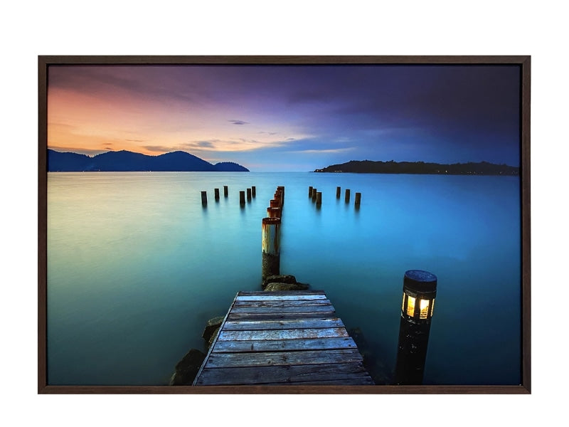 Printed on high quality pearlescent photography paper that provides exceptional image quality with enormously detailed sharpness and vivid colour, and finished with a high quality satin film that creates a soft lustre and non glare finish. The piece is assembled with no glass using a Matt open grain stained timber moulding, with D-Rings and strung with cord ready to hang.