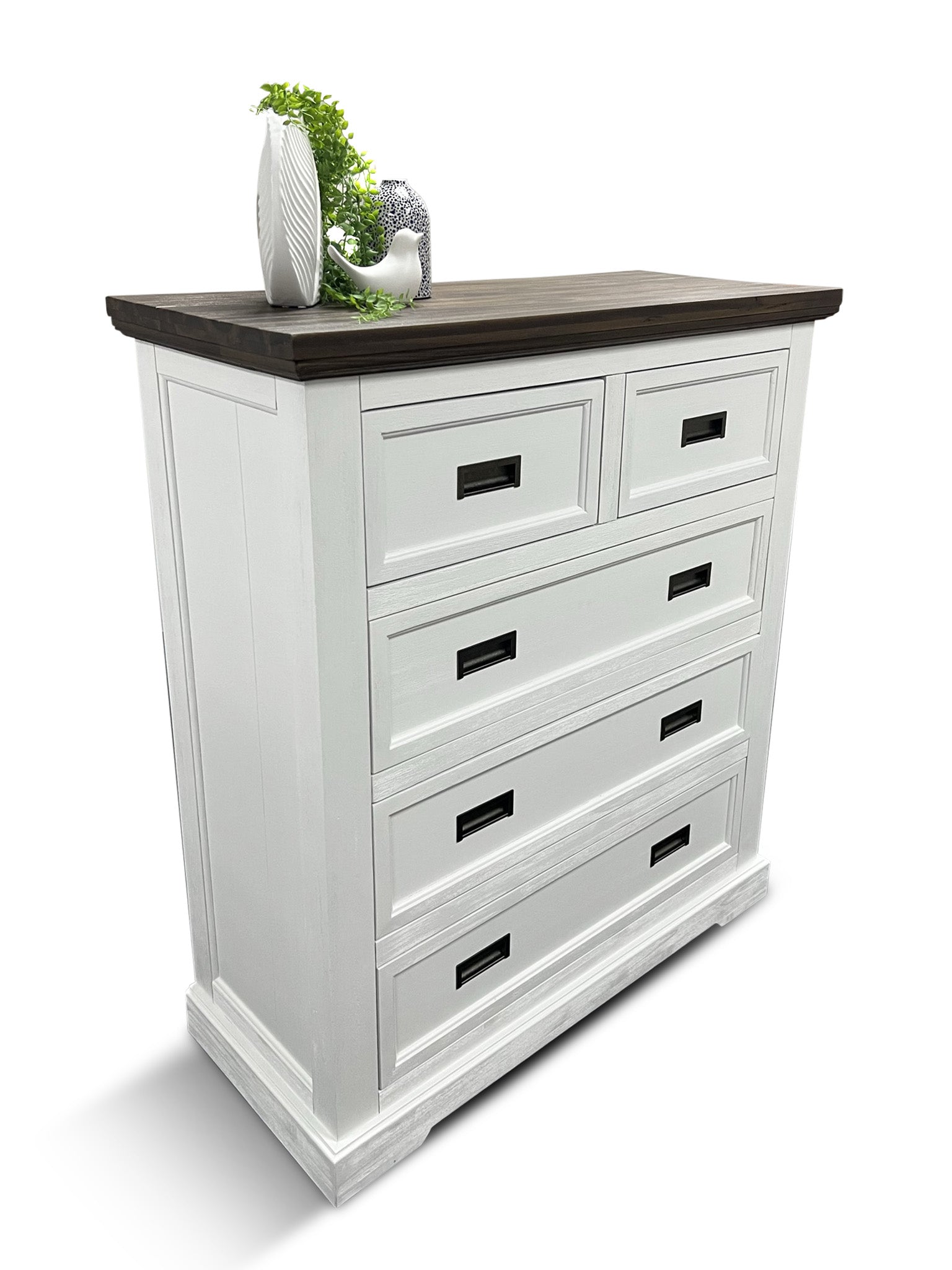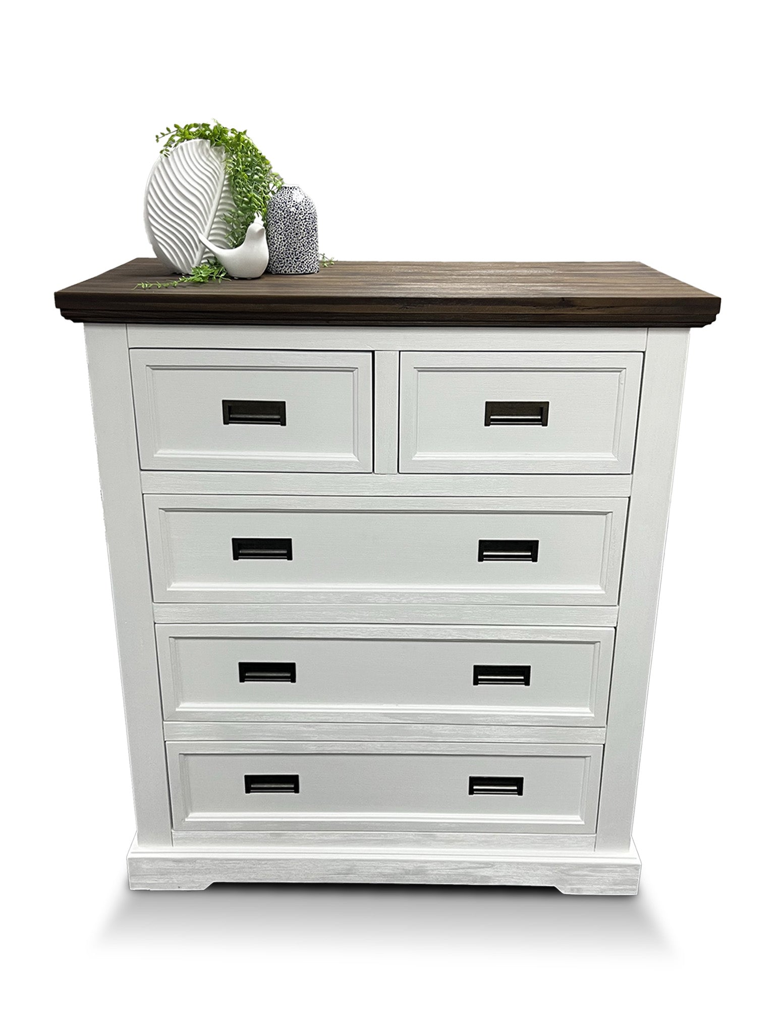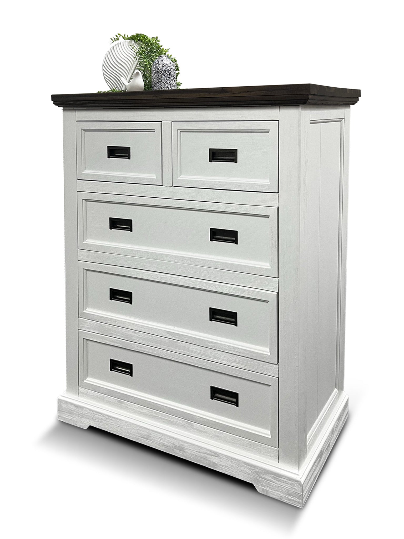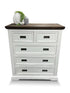 The Hamptons range of furniture features an elegant combination of white and brown two toned solid hardwood timber. The Hamptons combines the warm tones of timber with the lightness of a white exterior for a beachside feel with a contemporary twist. The Hamptons bedroom collections is available in a KIng or Queen bed, bedside chests, tallboy, dressing table with mirror and even a blanket box.