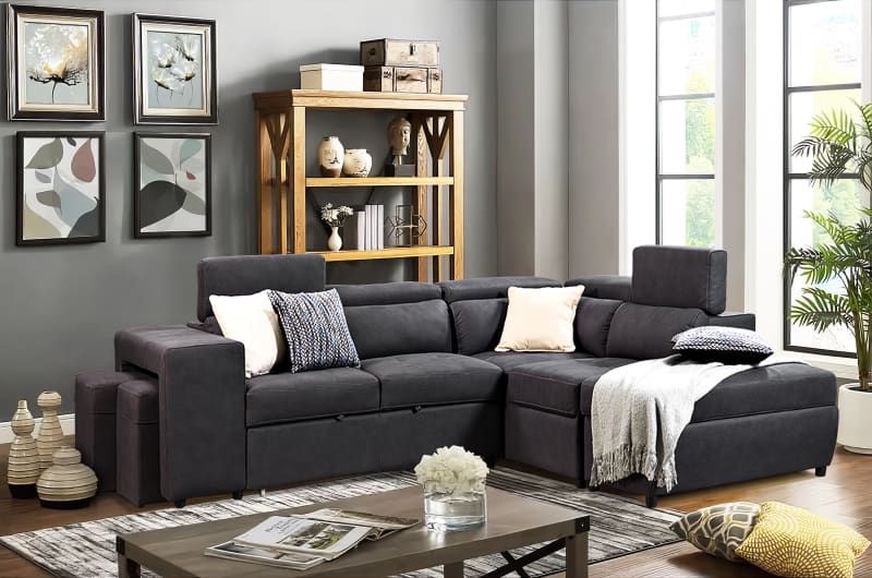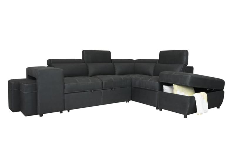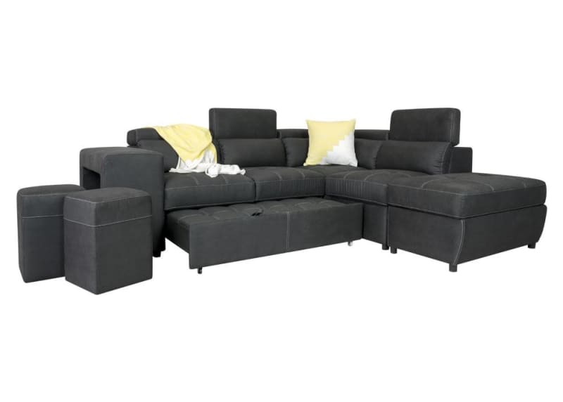 The hermes sofa has the lot, chaise, lift up storage, sofa bed and even extra stool for additional seating. Upholstered in our commercial grade rhino suede, this suite is built for family living. Available as left or right sided chaise
