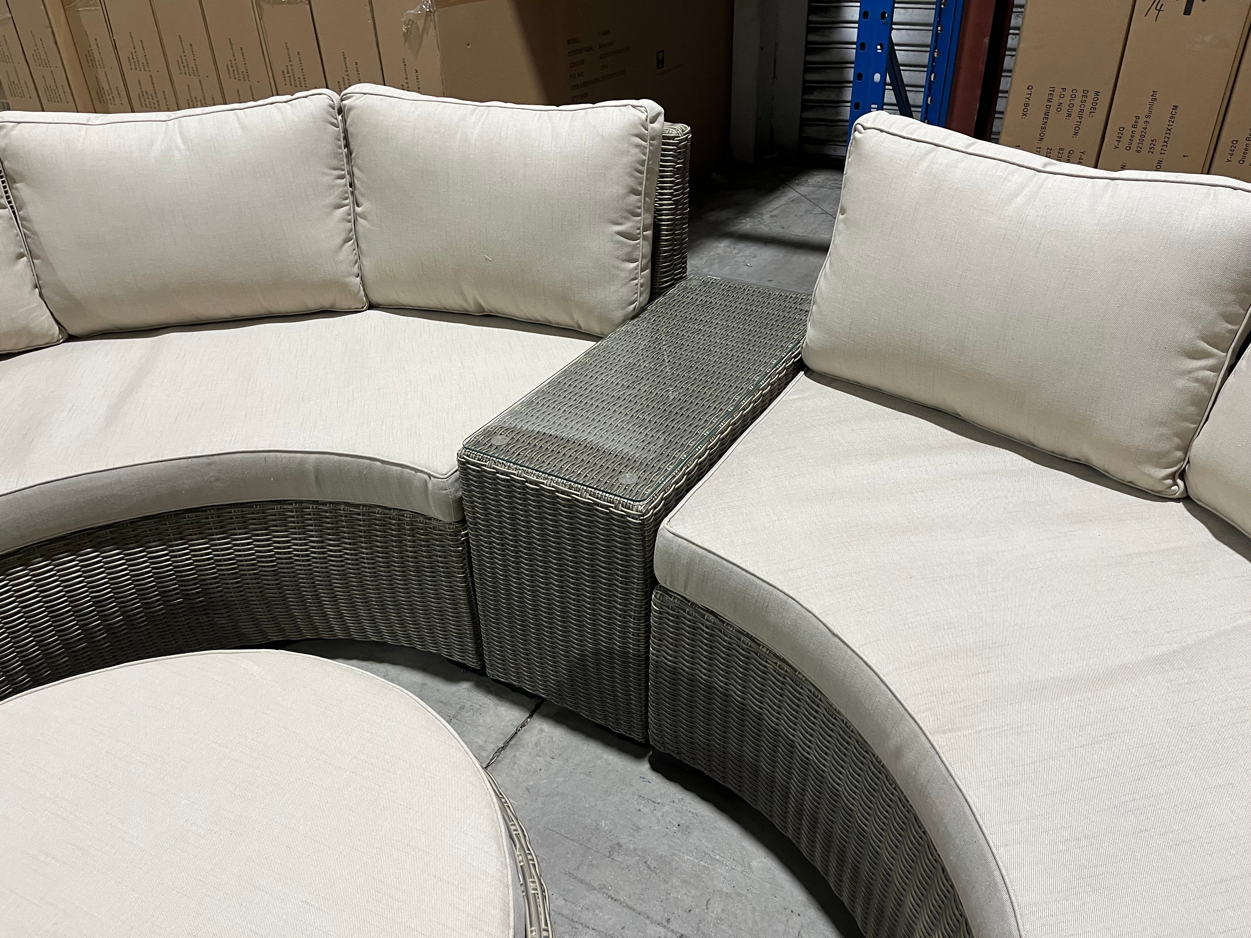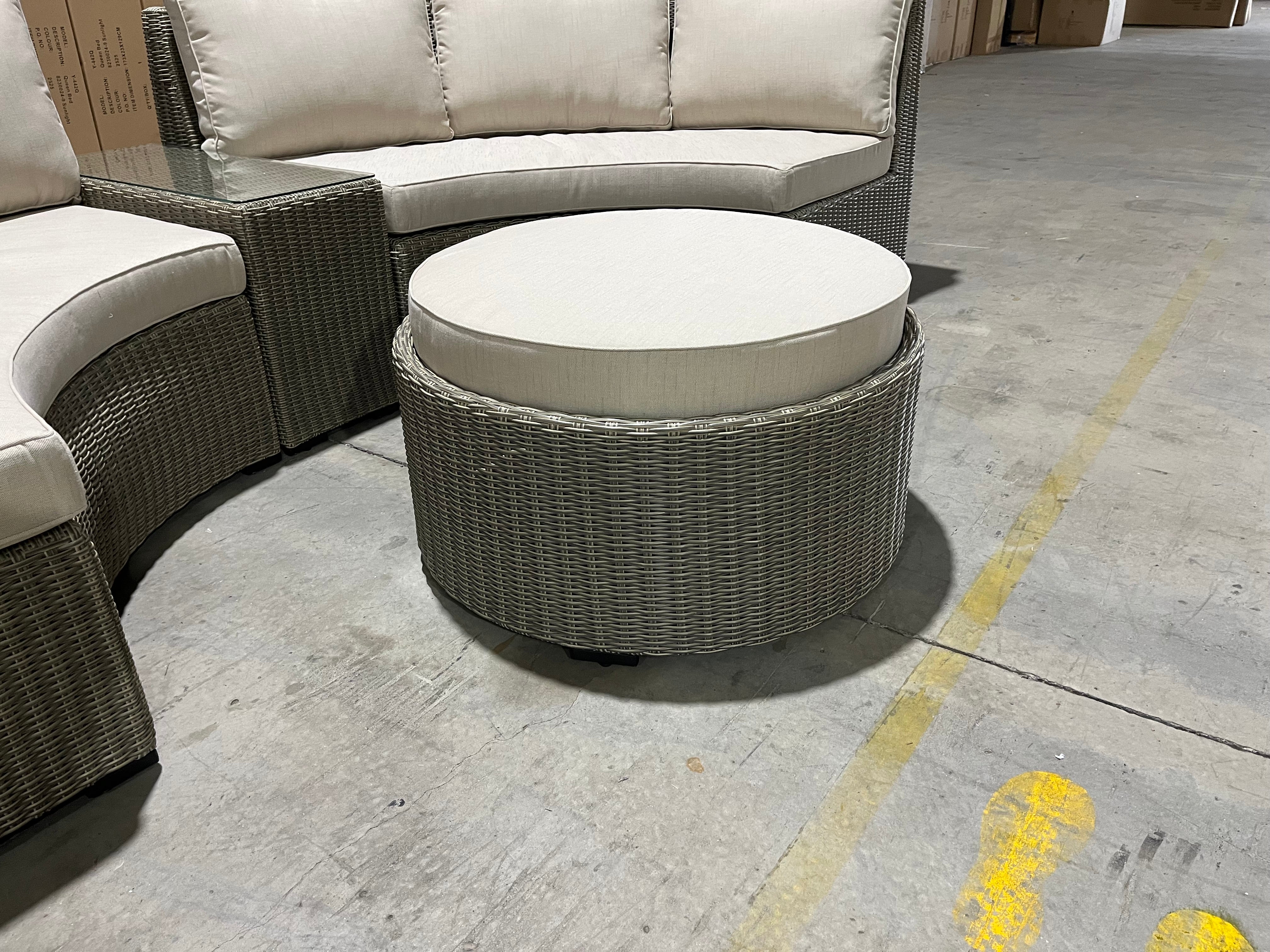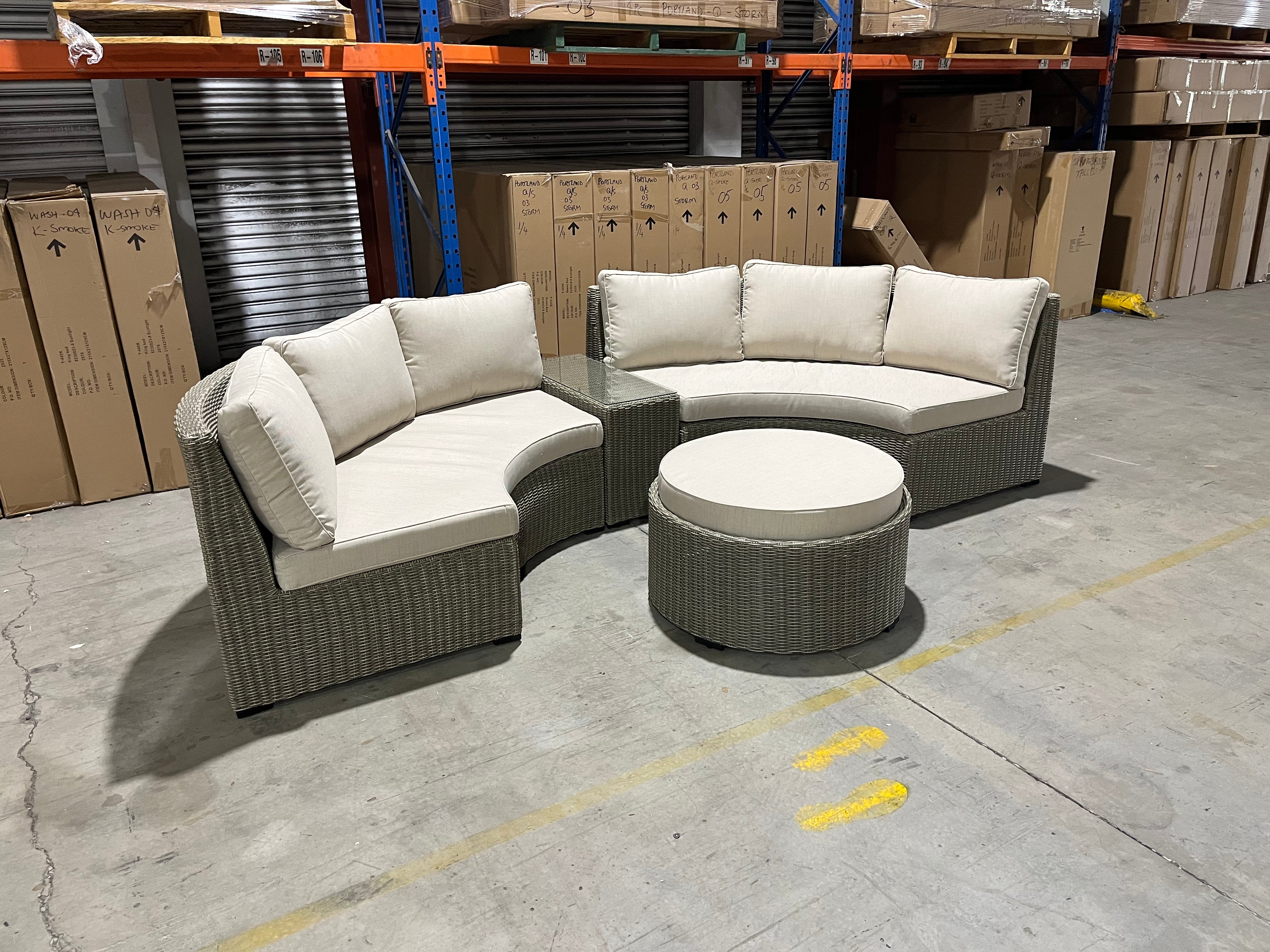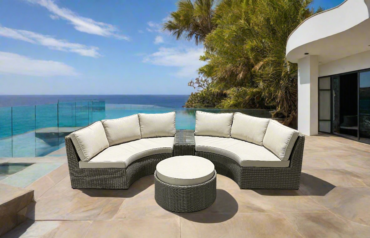 Experience a unique and contemporary lounge set with Lima 4pce! Its stylish half moon shape is perfect for cozy fireside gatherings with friends. The set includes 2 seats, console, and ottoman. Dare to be different and elevate your outdoor space!