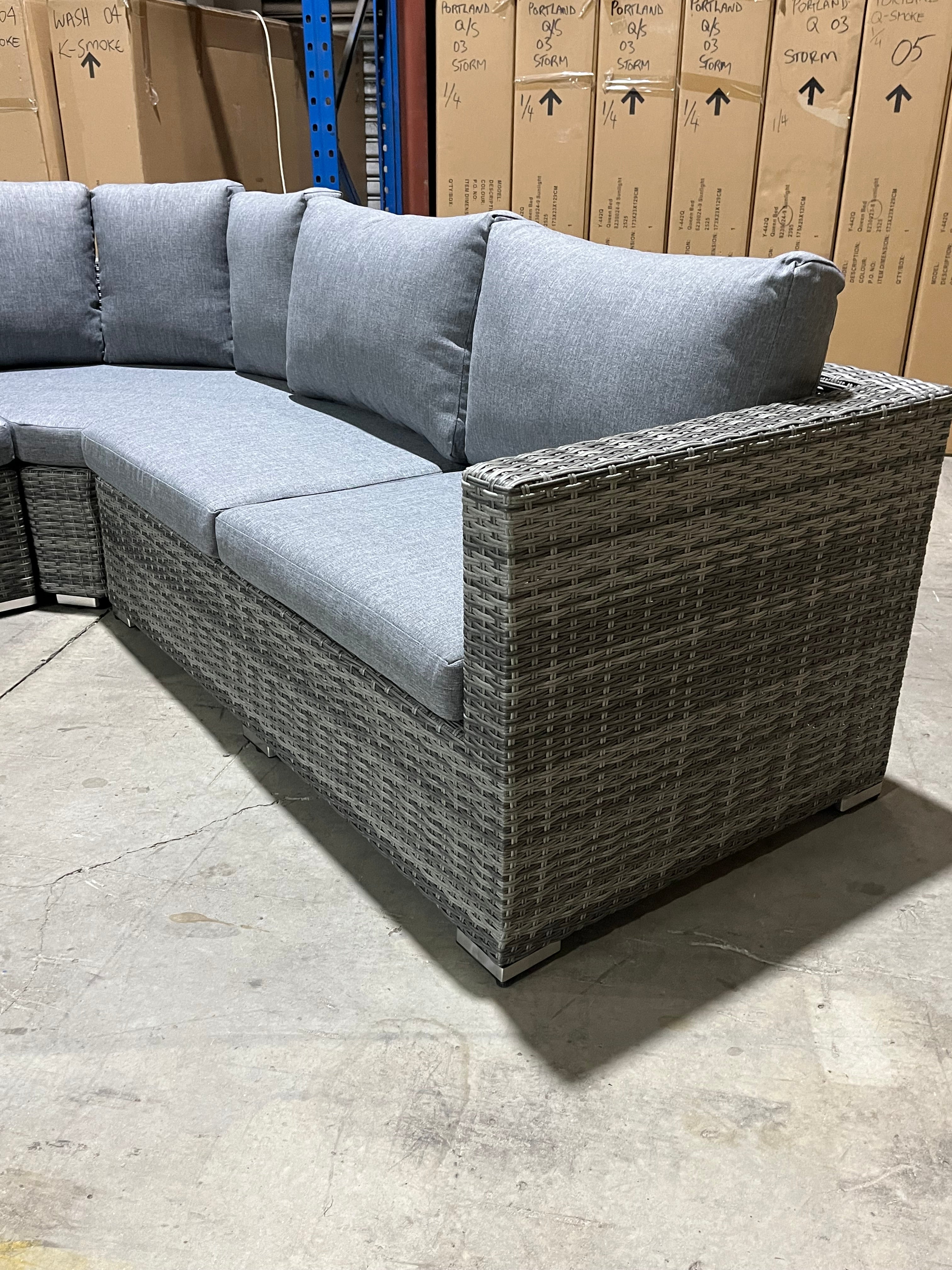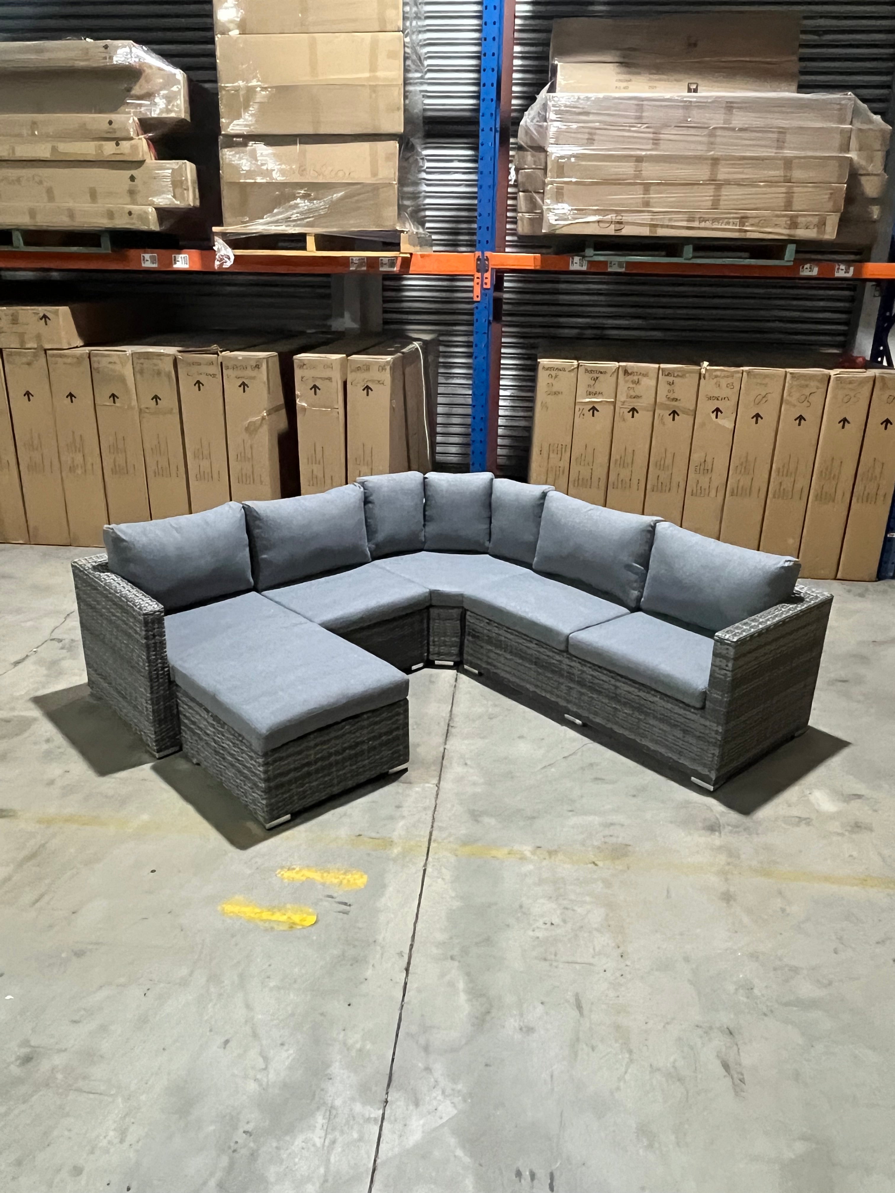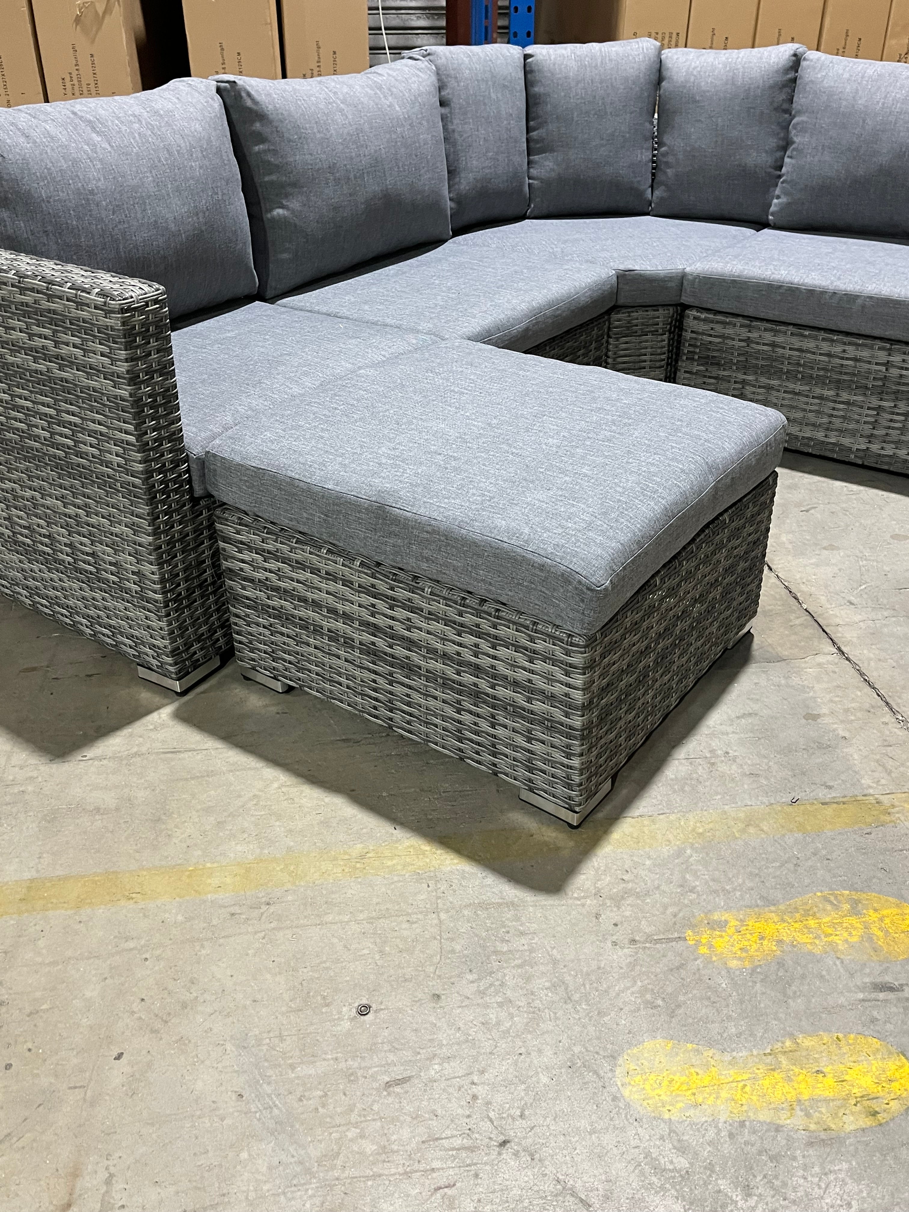 Get ready to lounge in style and comfort with the Swiss Corner Outdoor Lounge! This unique lounge includes an ottoman that can be used as a coffee table or chaise, making it perfect for any outdoor space. The corner configuration adds a touch of elegance, while the durability promises years of enjoyment.