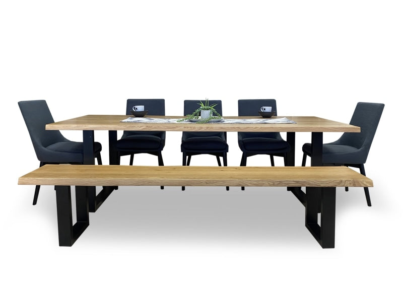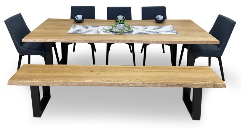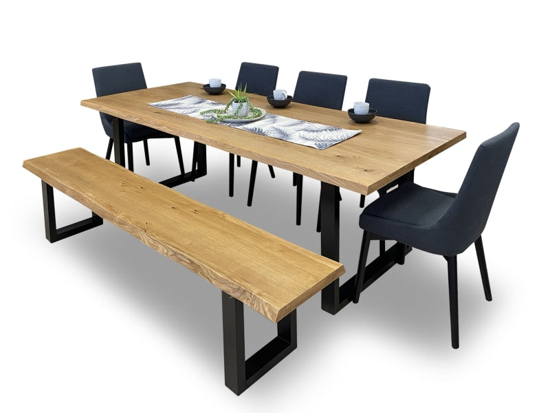 Our versatile Tuscany dining range with a cracking oak finish, trending live edge and heavy steel leg, is available in 3 versatile sizes with different chair & bench options (benches available in 1.9m & 2.2m lengths).