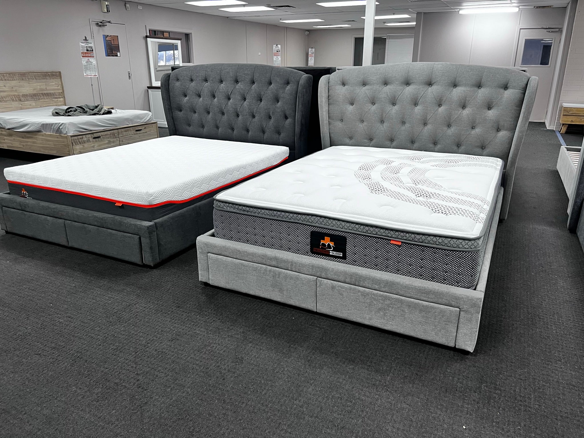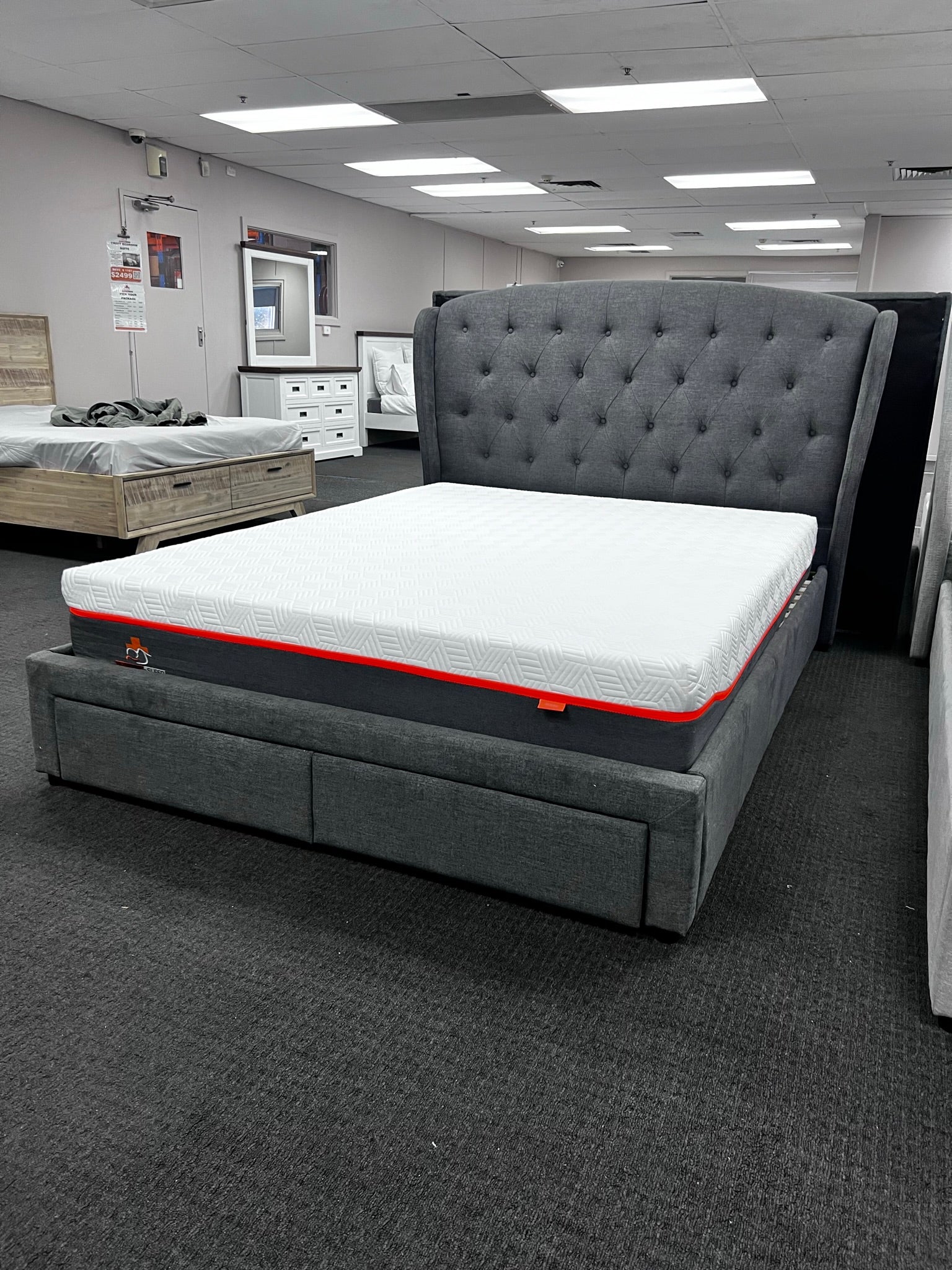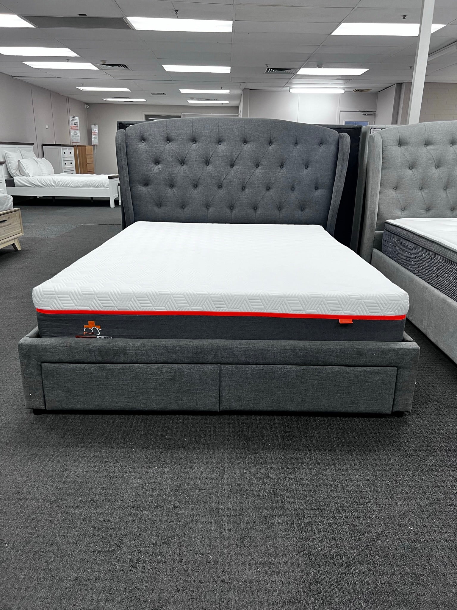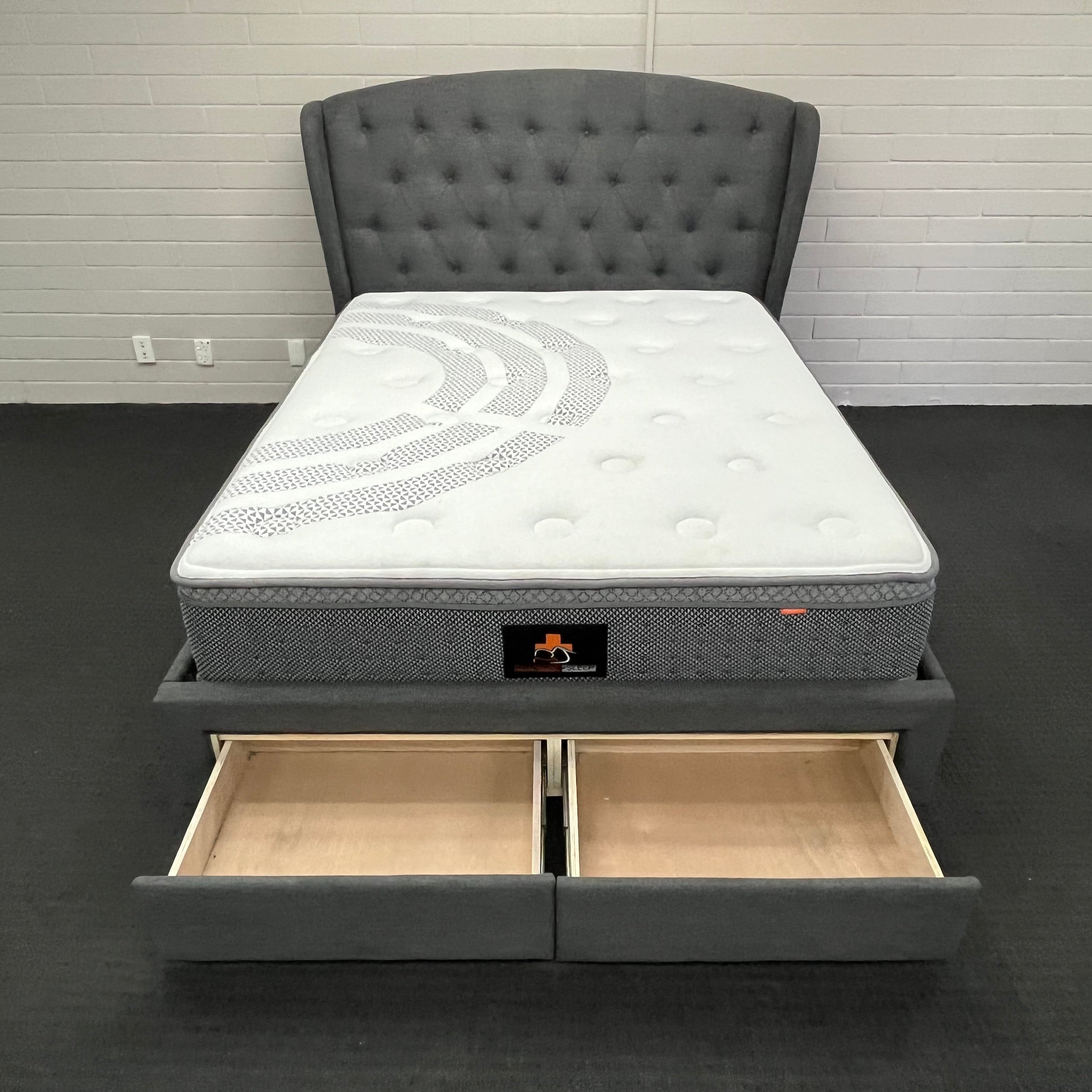 Discover the perfect blend of style and practicality with the Washington Bed Frame. Available in queen or king sizes and light or dark grey, this frame features 2 storage drawers on runners for added convenience. The stunning hand tufted headboard adds a touch of elegance to any bedroom.