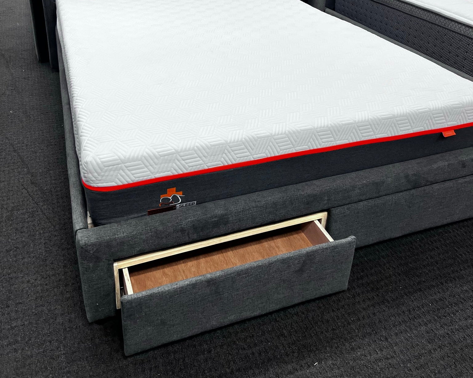 Includes storage drawers on runners, Available in storm or smoke grey