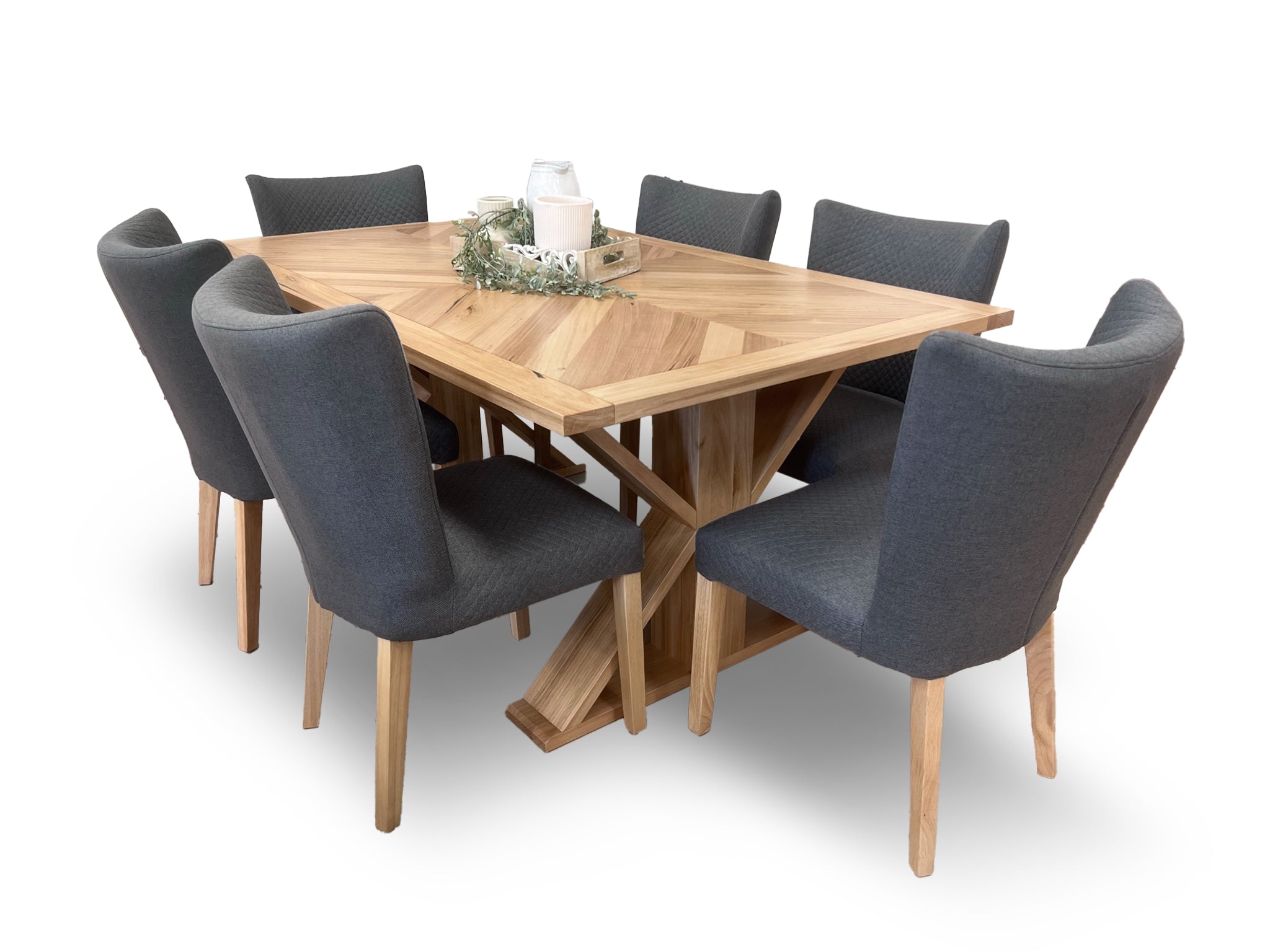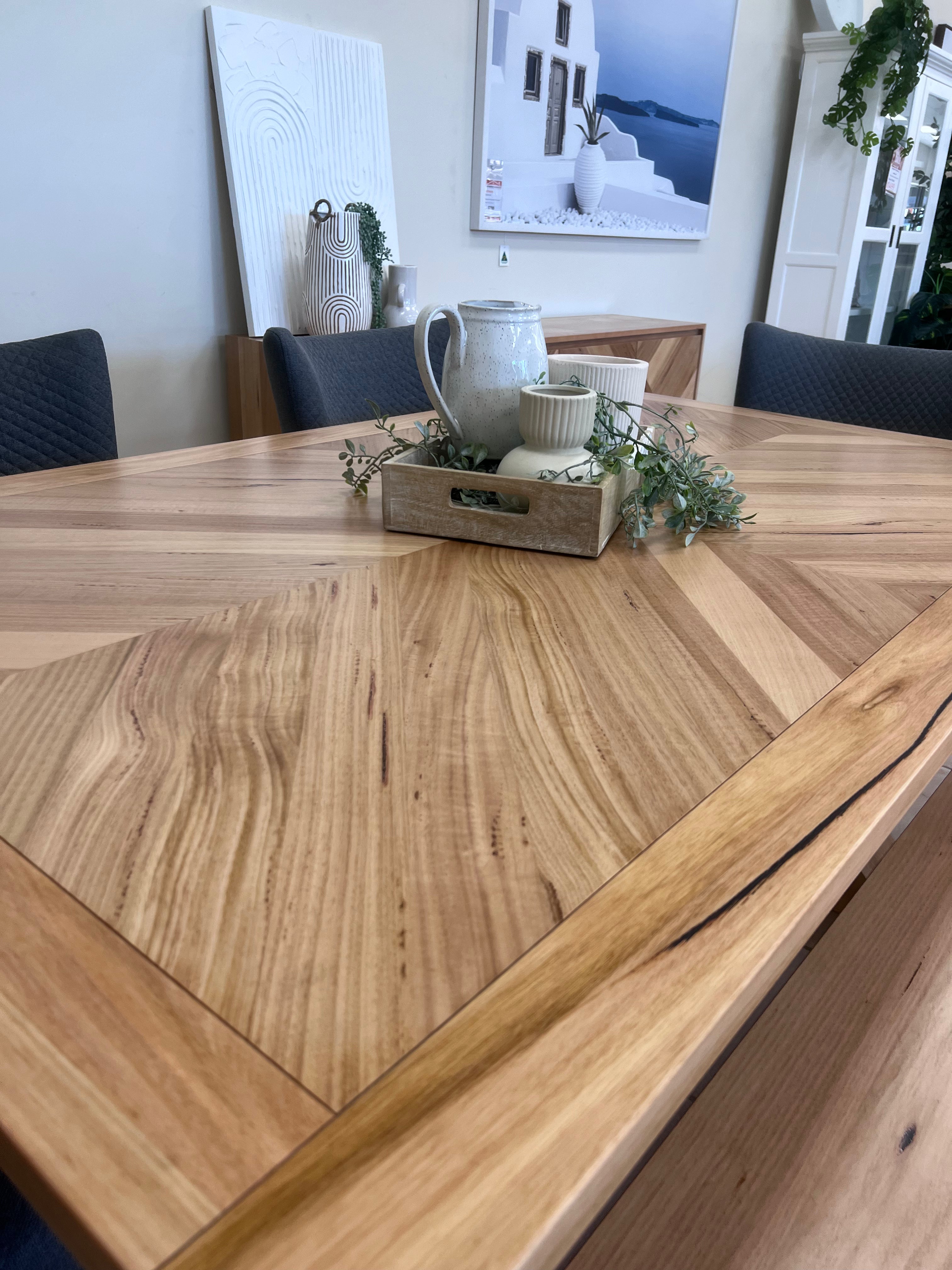 Bring a regal elegance to your dining area. Our stunning Westport range is featured in Messmate Timbers with a clear coat allowing for the pure beauty and design of the parquetry inlay to truly be the star of the show.