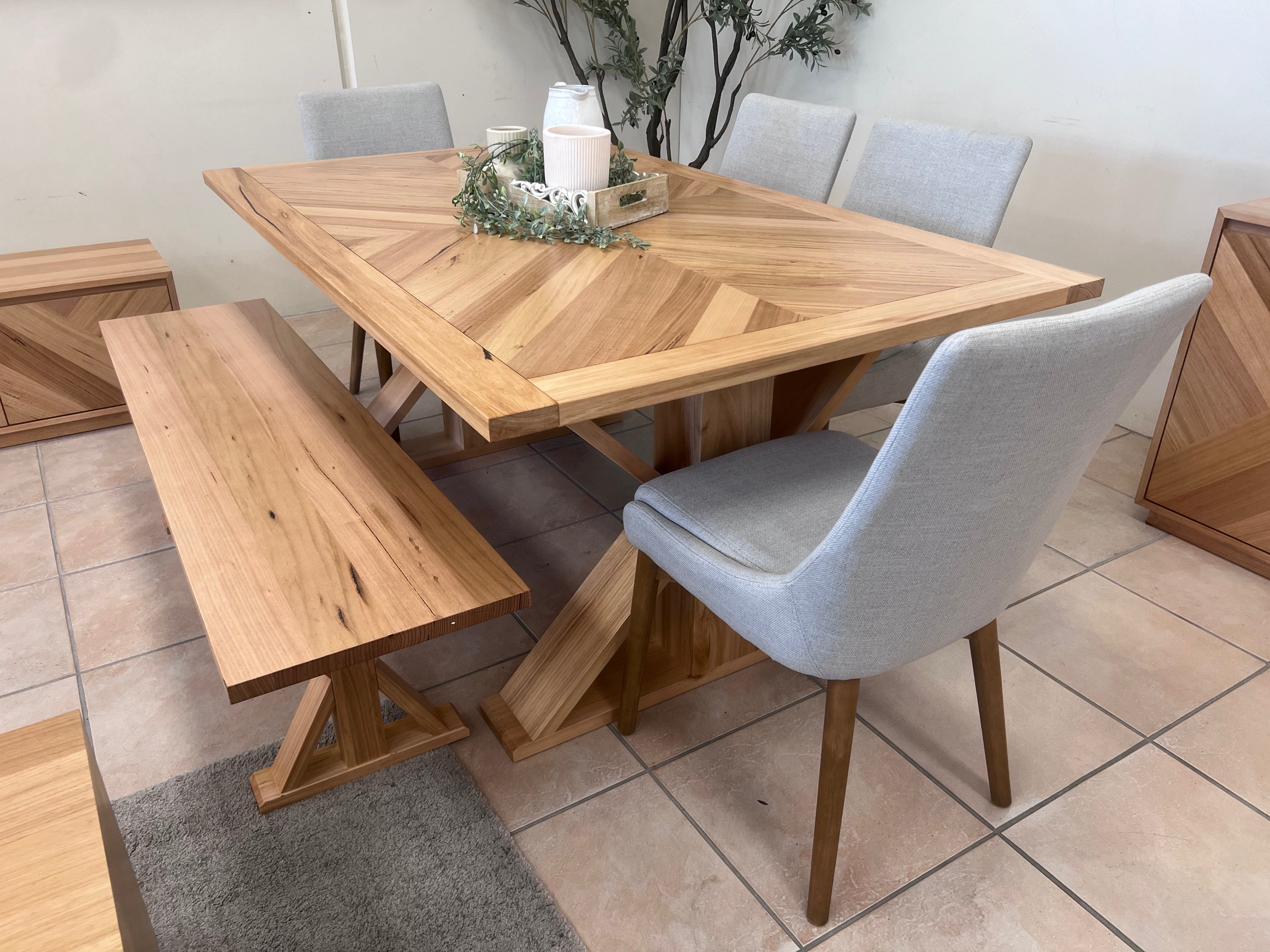 Bring a regal elegance to your dining area. Our stunning Westport range is featured in Messmate Timbers with a clear coat allowing for the pure beauty and design of the parquetry inlay to truly be the star of the show.